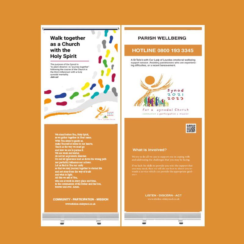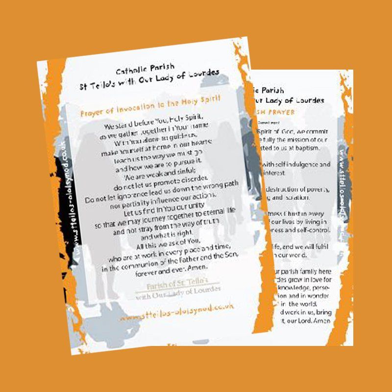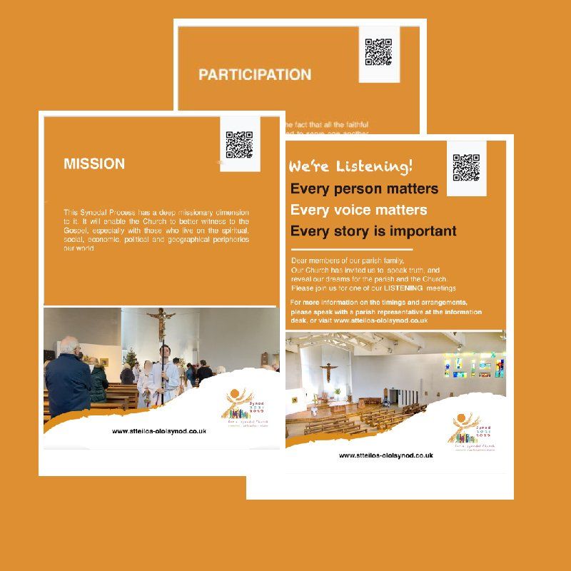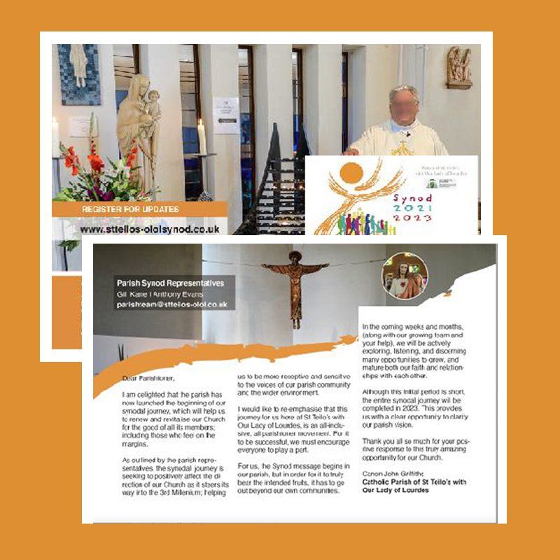 A5 double-sided lealets with general Synod information on the front, and Parish Priest message, or Questions to be considered during the process on the reverse.